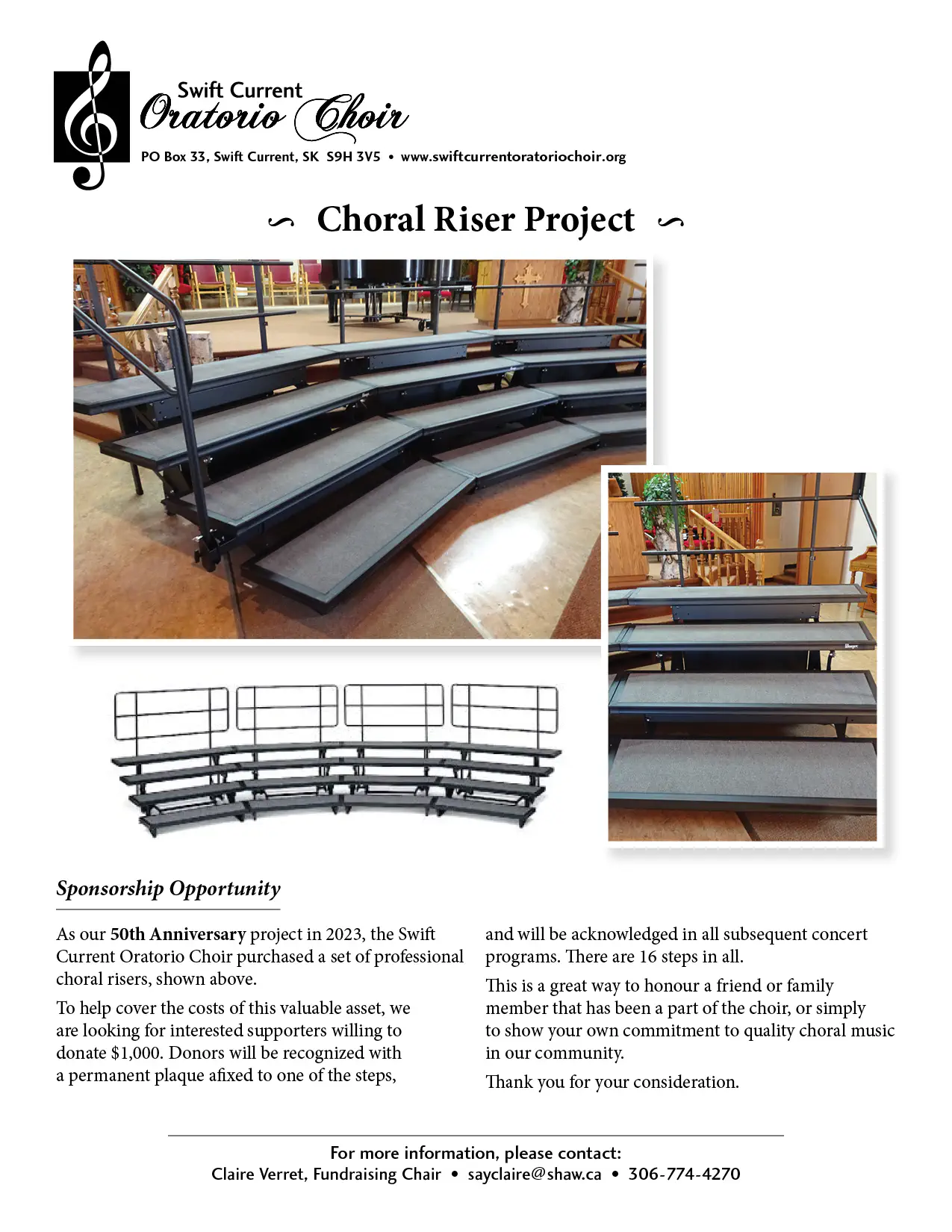Donors contributing $250 or more receive a complimentary ticket to the Spring Concert. Donors’ names (and if possible, logos and links to their websites) are also featured on our website. Tax deductible receipts are issued for all donations. Please make cheques payable to “Swift Current Oratorio Choir”, and forward to: